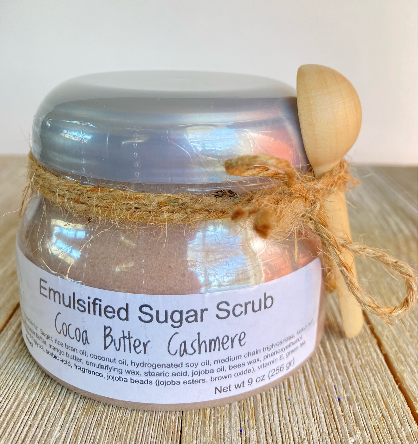 One of our most popular scents is absolutely scrumptious in this emulsified sugar scrub! The warm, buttery notes blend fabulously with the sweetness from the sugar. The light brown color is due to the tiny brown jojoba beads that were added for a bit of extra gentle scrubiness.